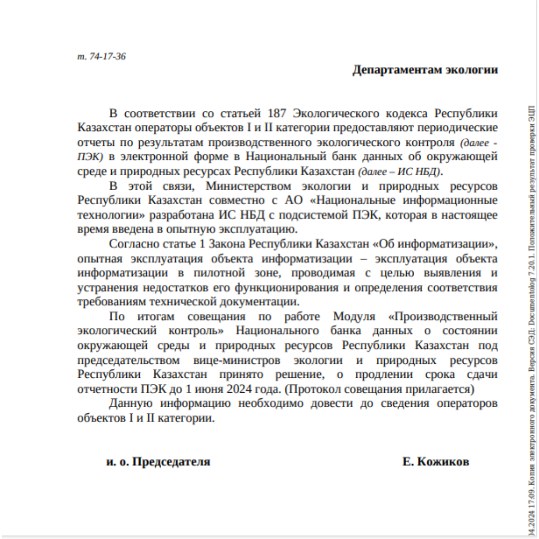 Министерство экологии и природных ресурсов Казахстана объявило о продлении срока сдачи периодических отчетов по результатам производственного экологического контроля (ПЭК) до 1 июня 2024 года. Это решение было принято на совещании, проведенном под председательством вице-министров экологии и природных ресурсов.